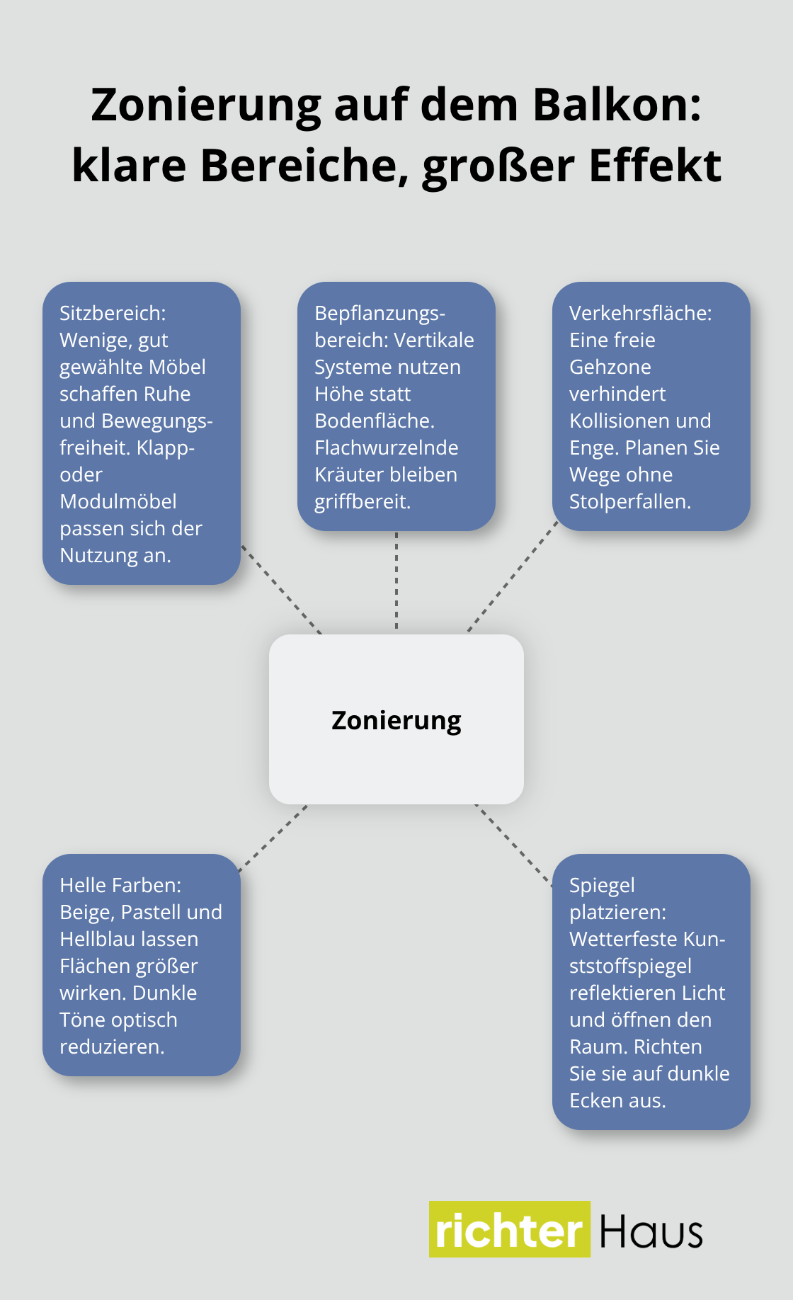 Die richtige Zonierung macht den Unterschied aus. Teilen Sie Ihren Balkon bewusst in Bereiche ein: einen Sitzbereich mit wenigen, gut gewählten Möbeln, einen Bepflanzungsbereich mit vertikalen Systemen und eine freie Verkehrsfläche, damit Sie sich ungezwungen bewegen können. Diese Aufteilung verhindert, dass der Balkon vollgestellt wirkt, obwohl Sie funktional alles Wichtige unterbringen. Helle Farben bei Möbeln und Textilien lassen den Raum größer wirken – Beige, zartes Hellblau oder Pastelltöne sind dabei besser geeignet als dunkle Farbtöne.